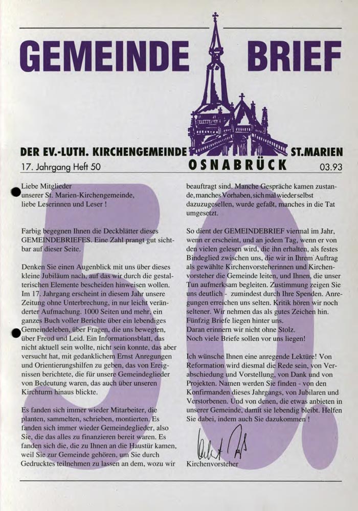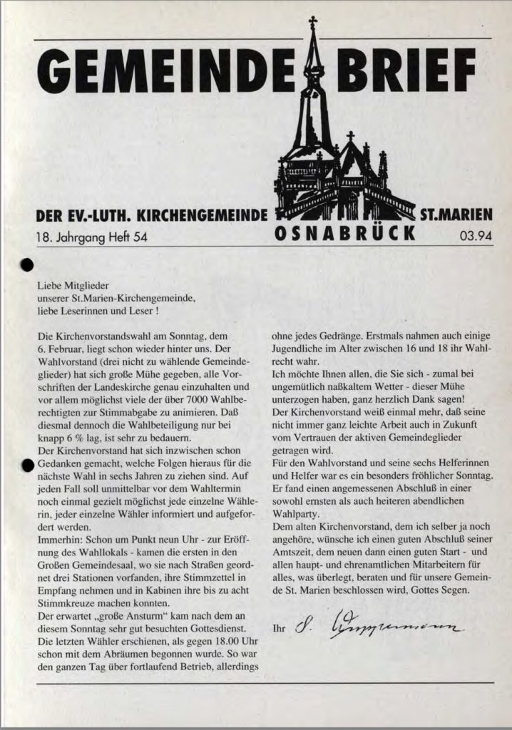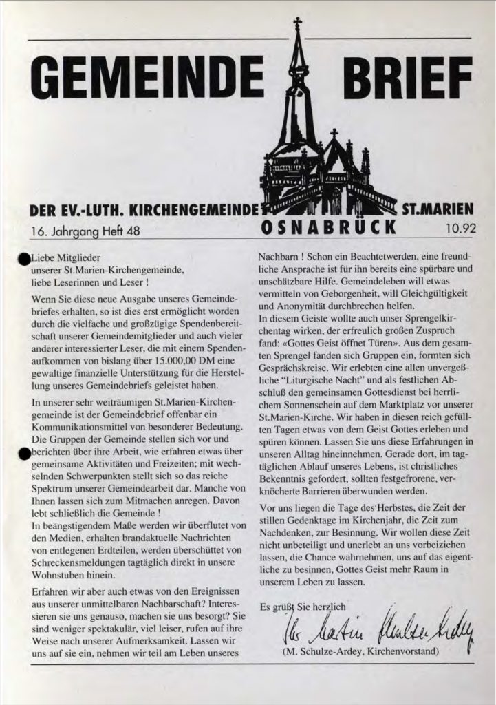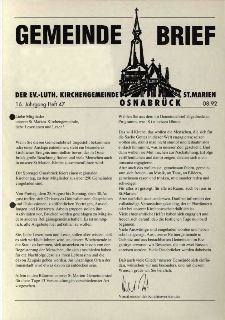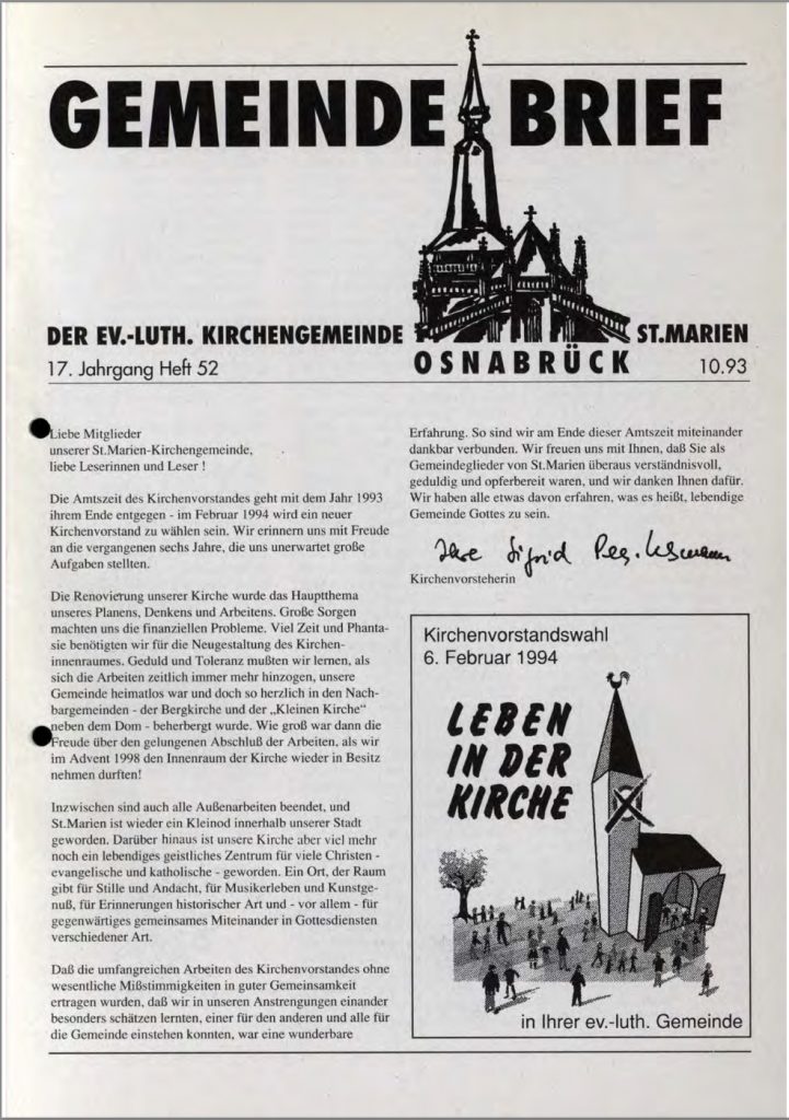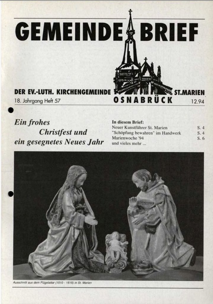 Im Gemeindebrief-Archiv können Sie nach älteren Gemeindebriefausgaben suchen und sich so über das Gemeindeleben wie auch die kulturellen Veranstaltungen in St. Marien in den letzten knapp fünfzig Jahren informieren.