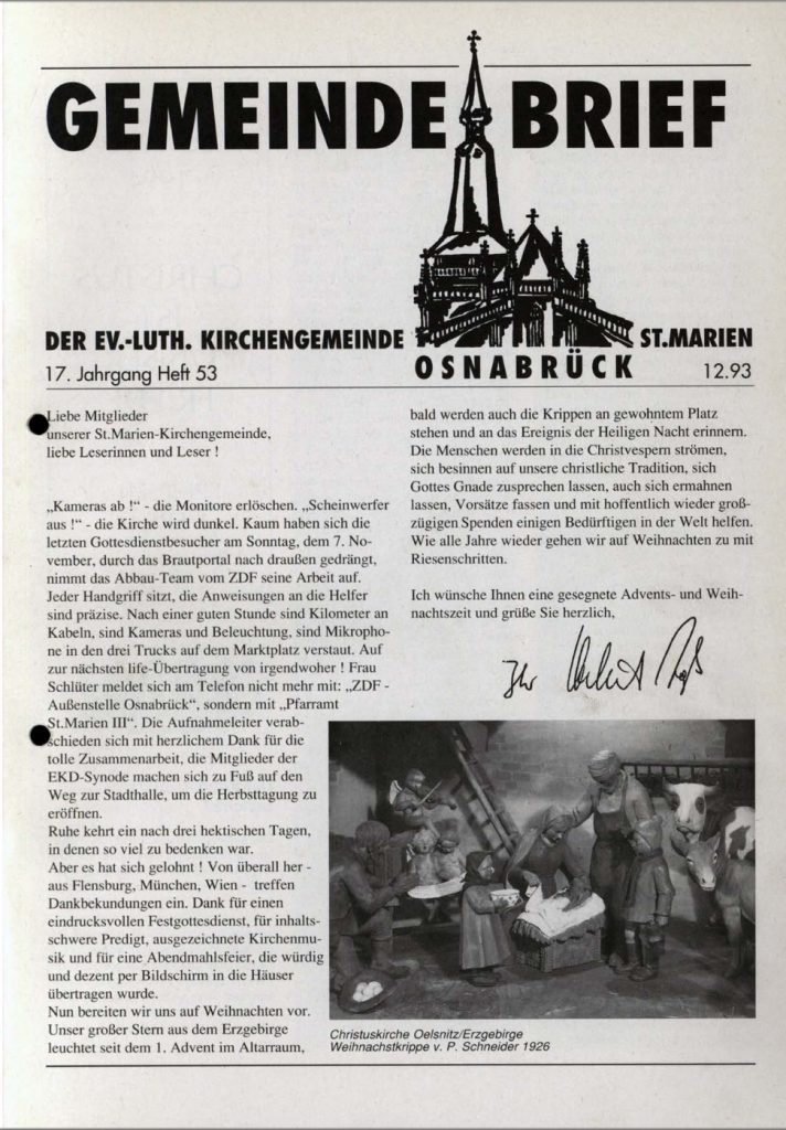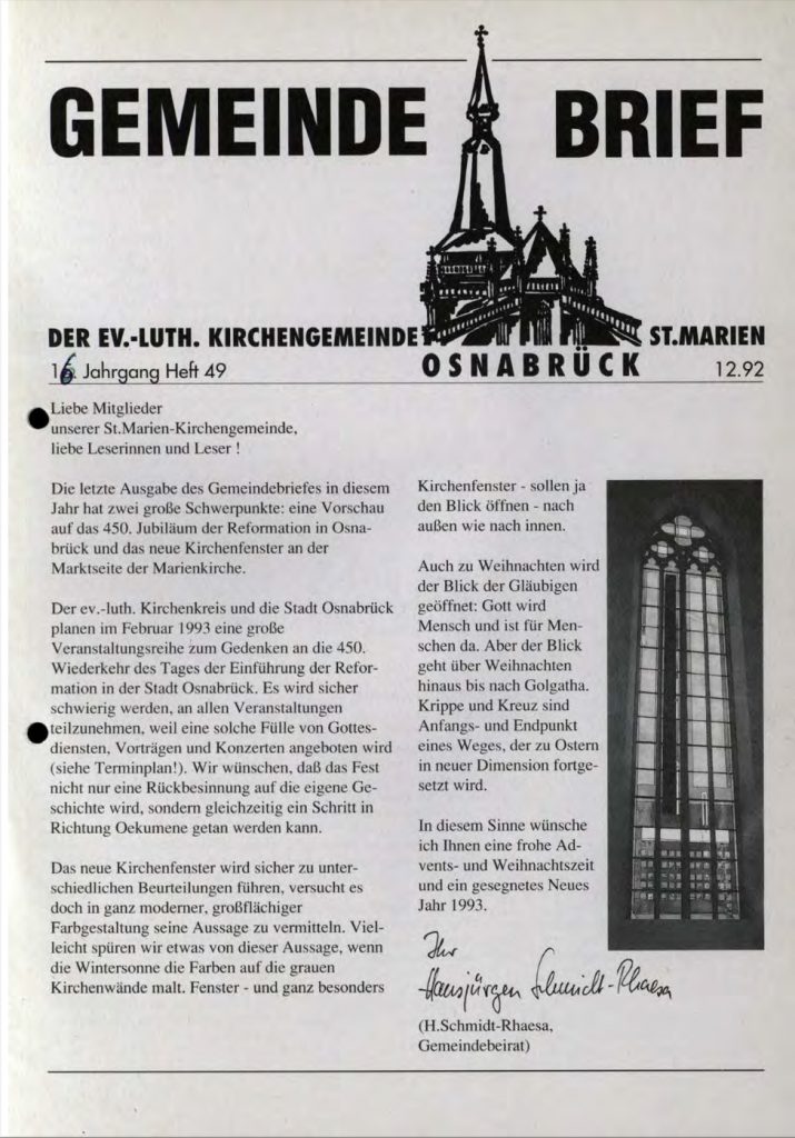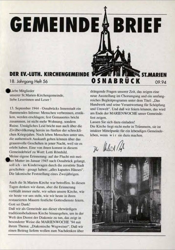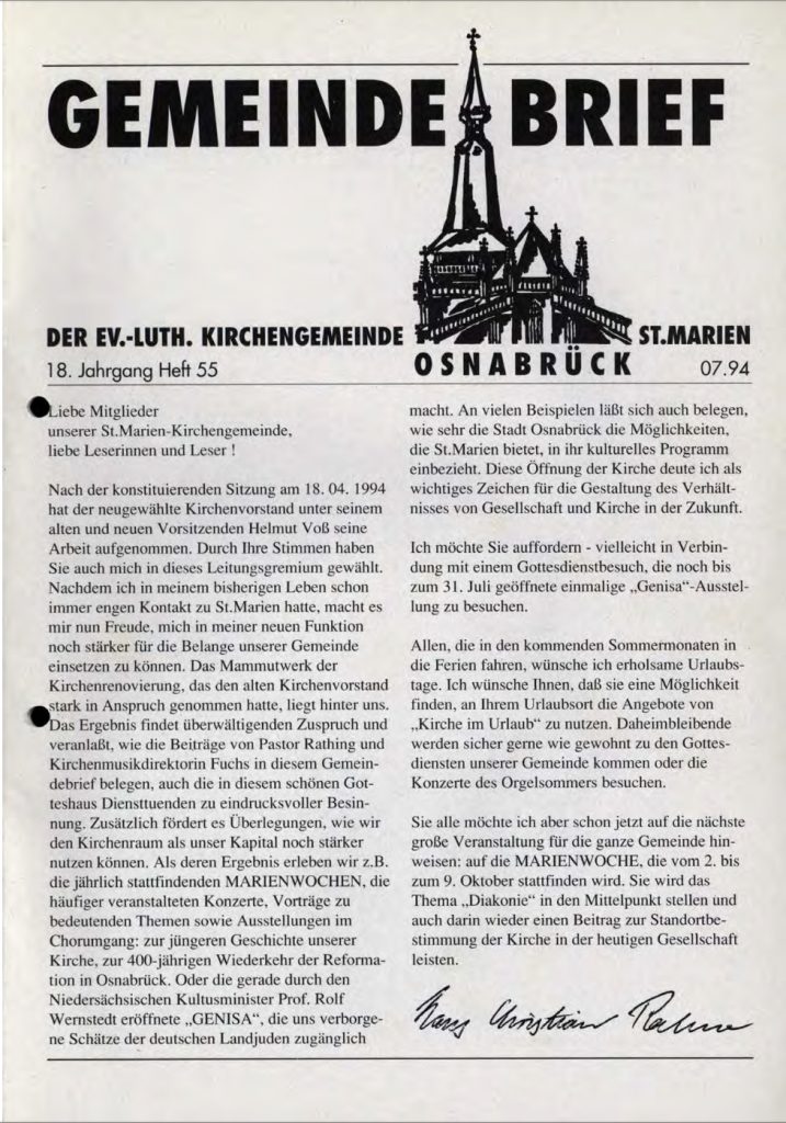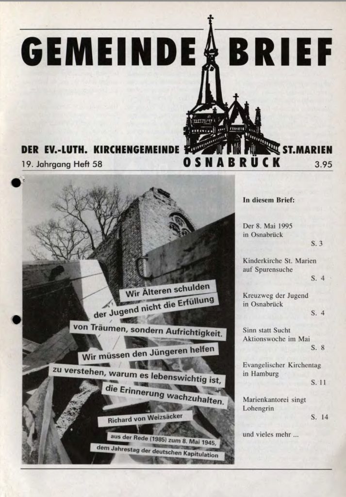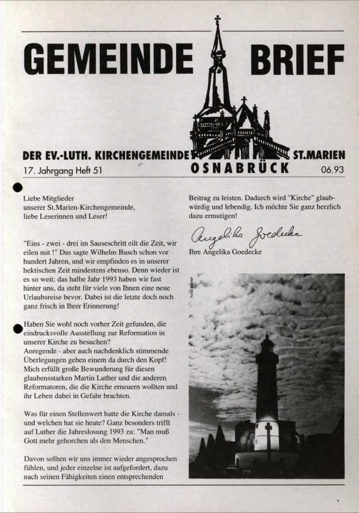 Im Gemeindebrief-Archiv können Sie nach älteren Gemeindebriefausgaben suchen und sich so über das Gemeindeleben wie auch die kulturellen Veranstaltungen in St. Marien in den letzten knapp fünfzig Jahren informieren.