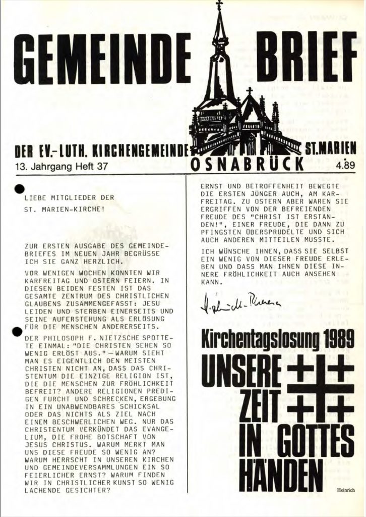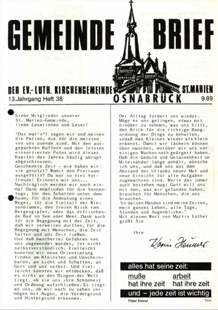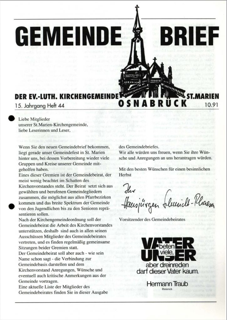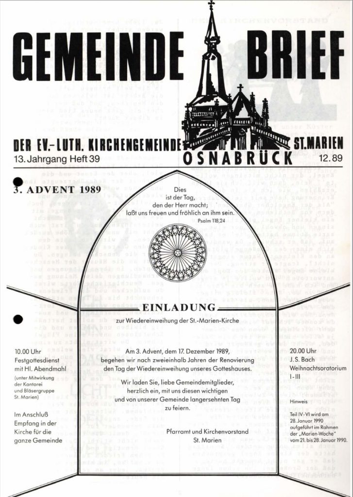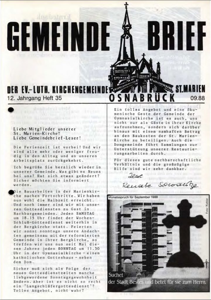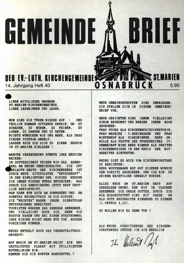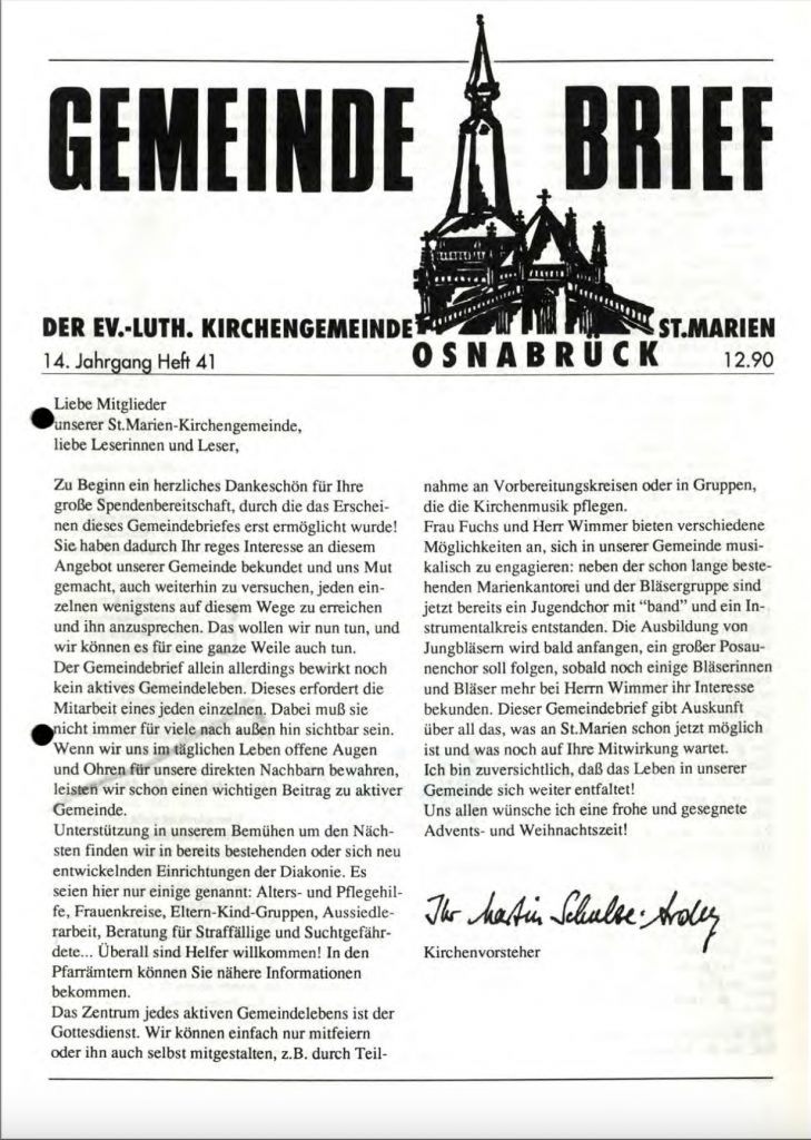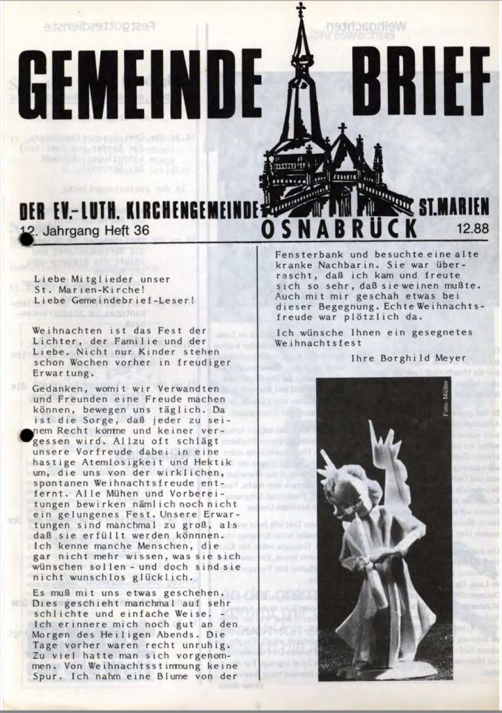 Im Gemeindebrief-Archiv können Sie nach älteren Gemeindebriefausgaben suchen und sich so über das Gemeindeleben wie auch die kulturellen Veranstaltungen in St. Marien in den letzten knapp fünfzig Jahren informieren.