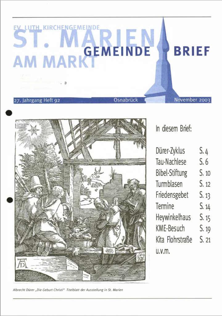 Der erste Gemeindebrief von St. Marien erschien 1977, mittlerweile gibt es 174 Ausgaben. Die Ausgaben 1 bis 131 wurden nachträglich digitalisiert, seit Ausgabe 132 erscheint der Gemeindebrief sowohl in gedruckter wie auch digitaler Form.
